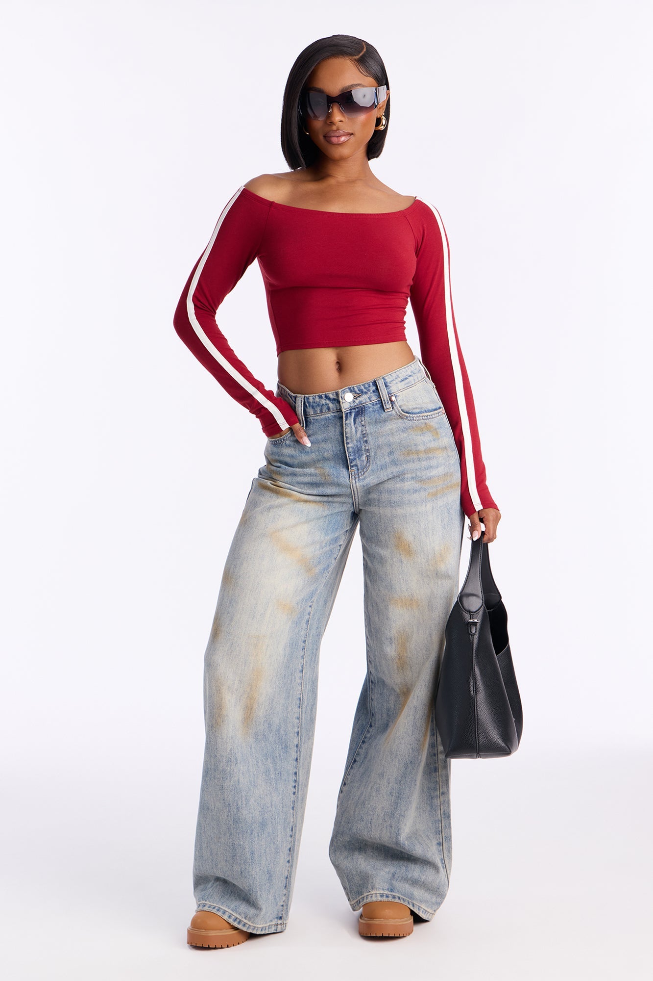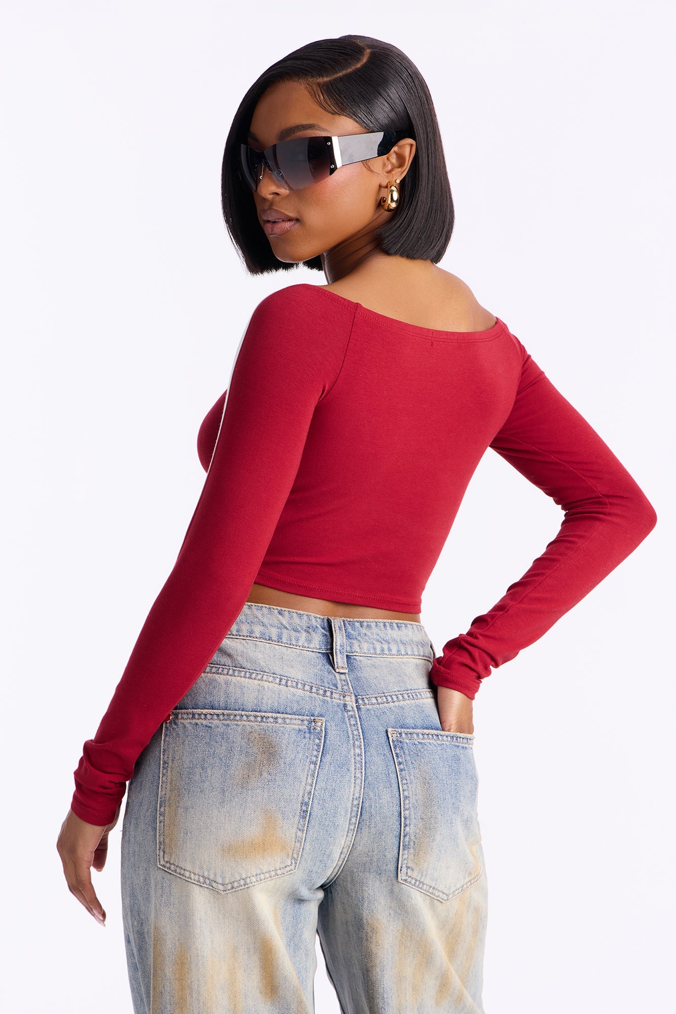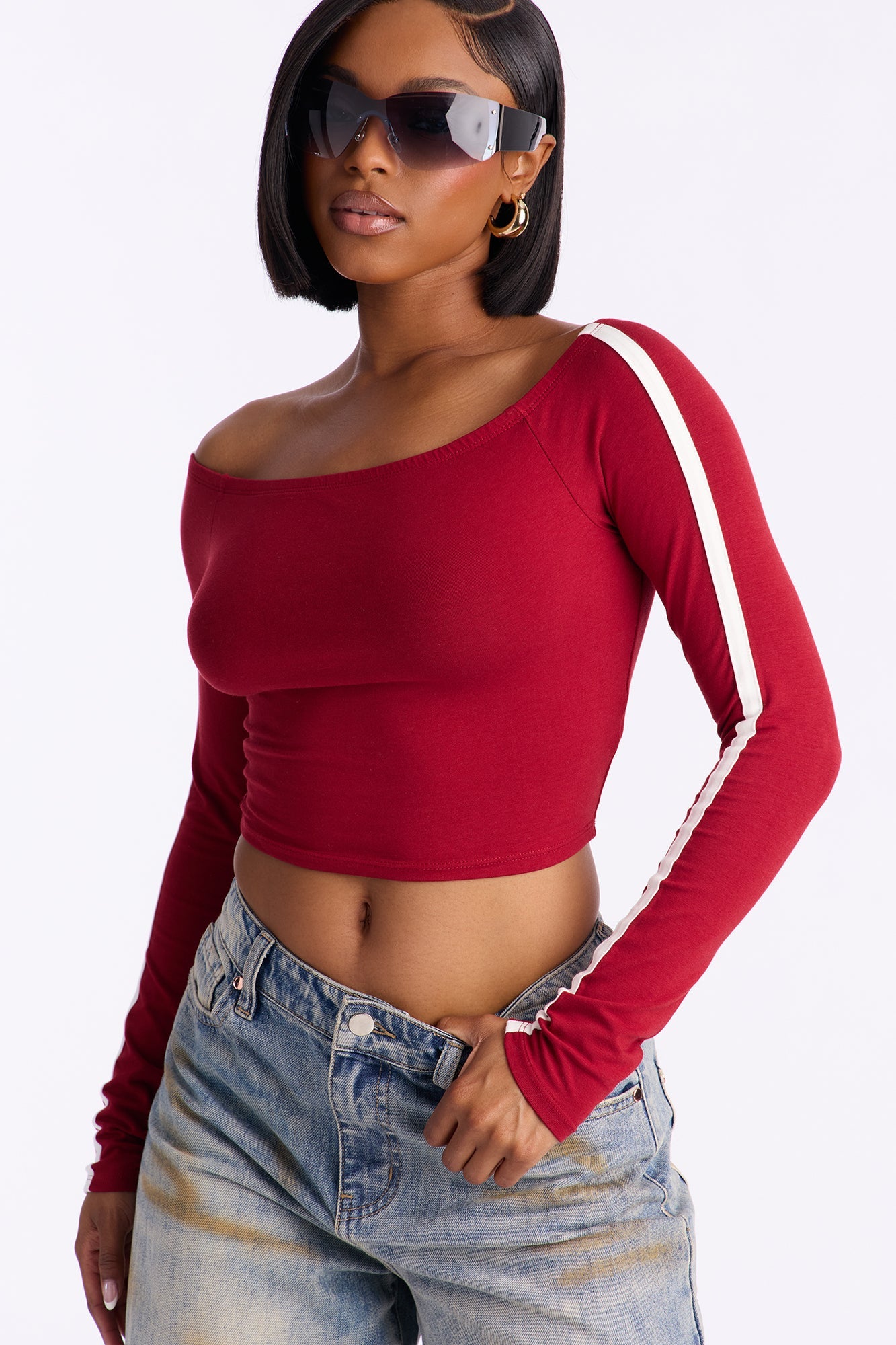 بلوزة كيلسي بأكمام طويلة ومكشوفة الكتفين - بورجوندي