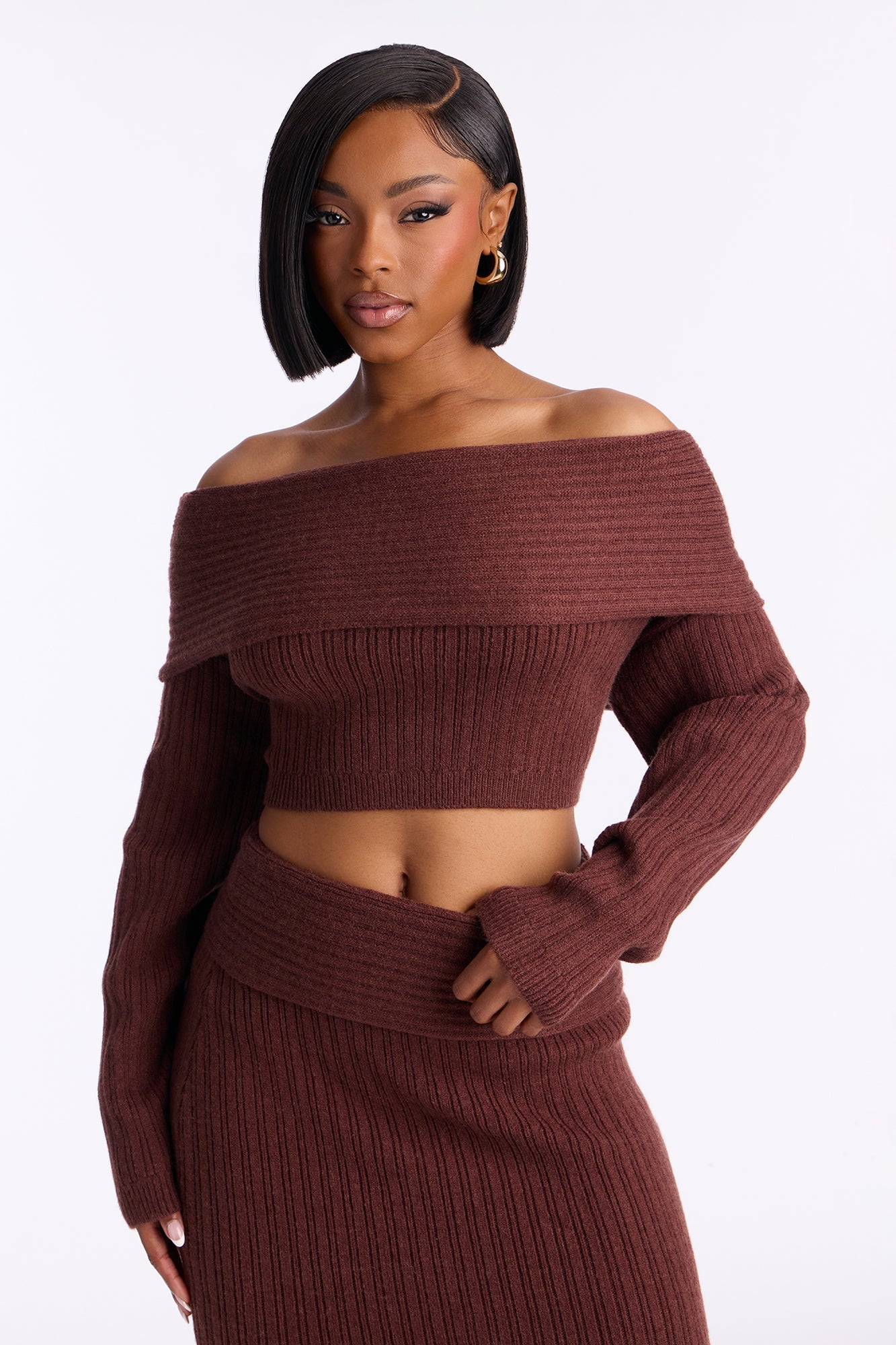 - كنزة بأكتاف مكشوفة وتنورة ماكسي