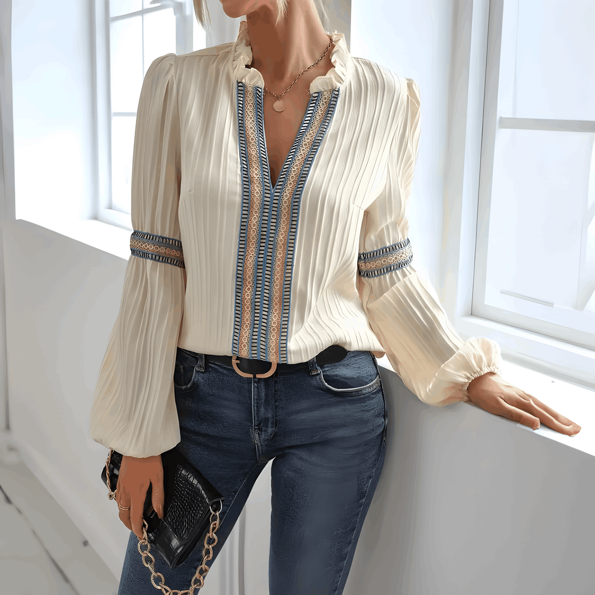 Maak kennis met de Angellica - Bescheiden Mouwblouse voor Vrouwen, waar comfort en verfijning samenkomen in één stijlvol ontwerp. Deze blouse is ontworpen voor vrouwen die zowel elegantie als gemak waarderen, met opvallende kantdetails en ballonmouwen die je natuurlijke charme benadrukken.